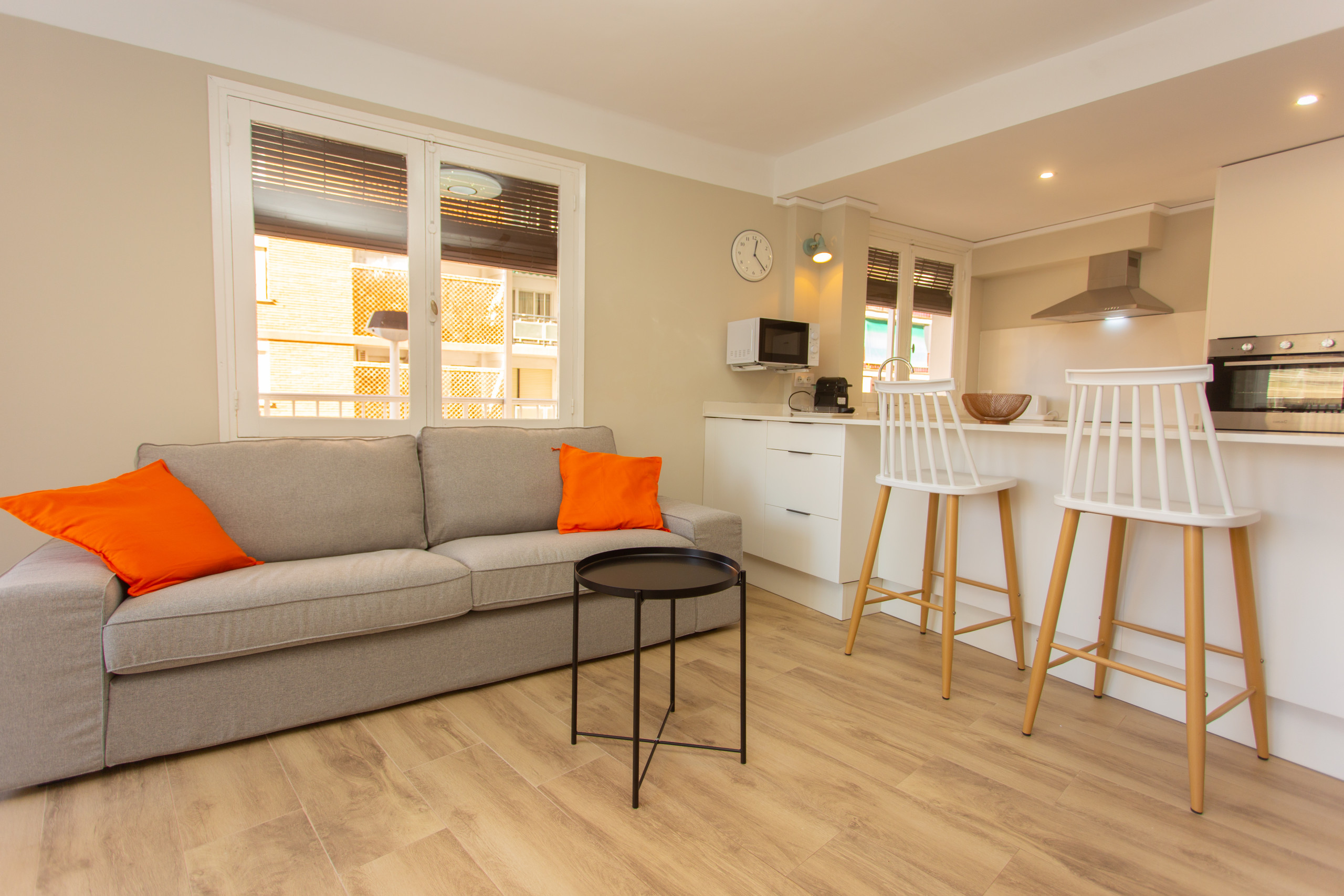 La cocina americana, de inducción, está totalmente equipada con nevera, microondas, horno, congelador, vajilla y cubertería, utensilios de cocina, cafetera, tostadora, hervidor de agua y exprimidor, para que puedas cocinar como en casa durante tu estancia.