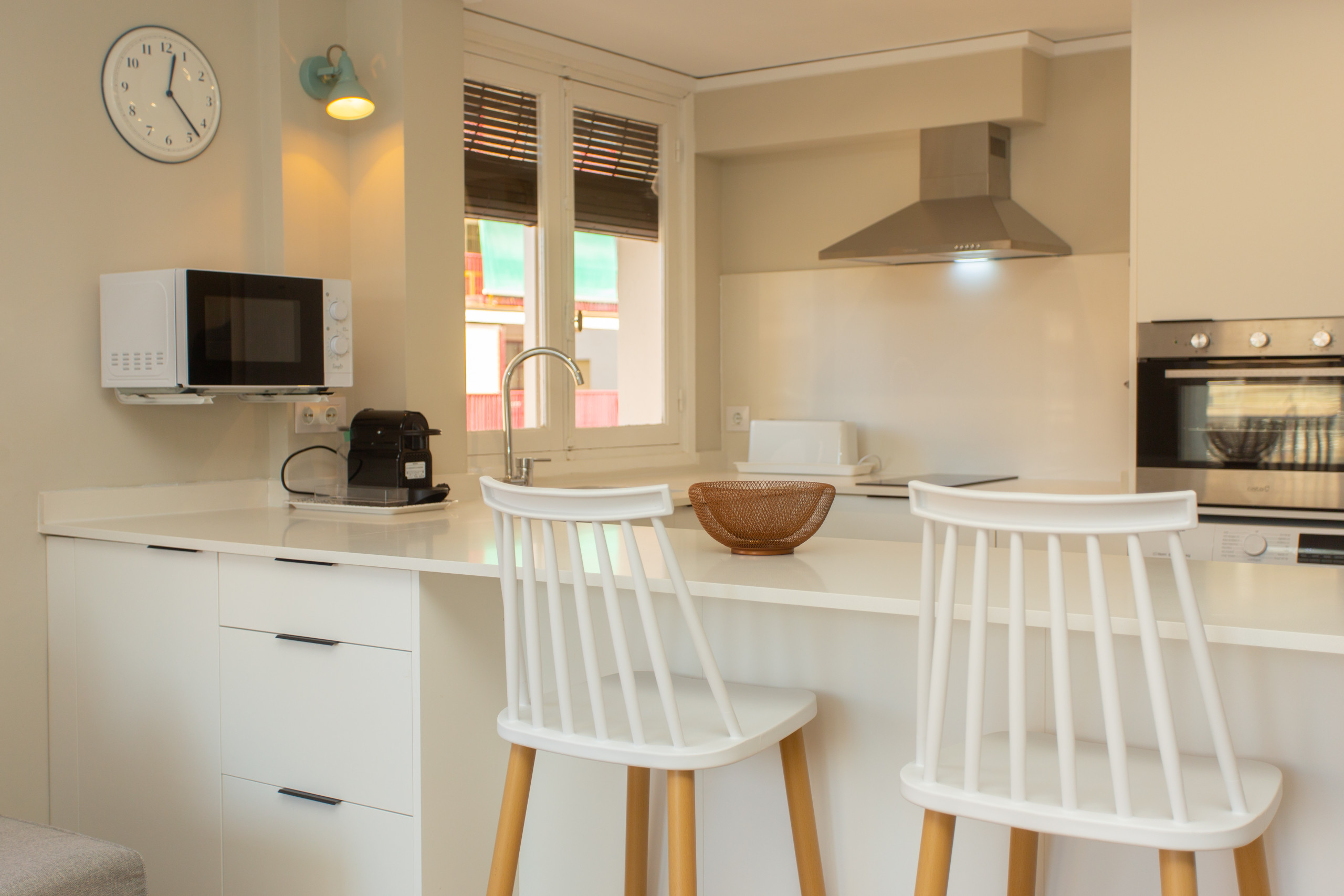 La cuisine américaine, à induction, est entièrement équipée d'un réfrigérateur, d'un micro-ondes, d'un four, d'un congélateur, de vaisselle et de couverts, d'ustensiles de cuisine, d'une cafetière, d'un grille-pain, d'une bouilloire et d'un presse-agrumes, pour que vous puissiez cuisiner comme chez vous pendant votre séjour.
